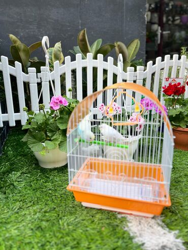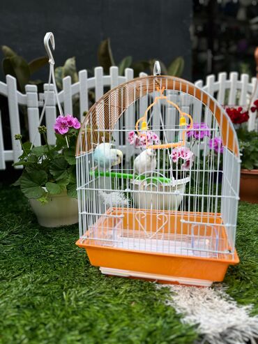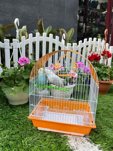 Dalğalı papağan və qəfəs dəsti - Növ: dalğalı (ağ-sarı başlı, yaşıl bədənli) kiçik papağan - Qəfəs: bənövşəyi altlıq və ağ metal barmaqlıqlar, şarjvari qövs damlı dizayn - Ölçü: hündür, geniş hərə...