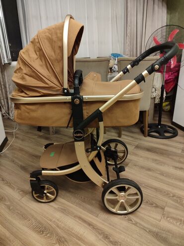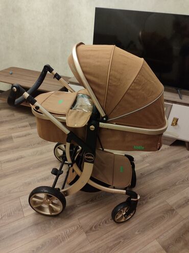 Uşaq arabası – beşik tipli, çevrilə bilən oturacaqla Xüsusiyyətlər: - Rəng: boz-bej tonlarda, qızılı çərçivə və tutacaq detalları - 2-si 1-də konstruksiya: dərin beşik kimi və oturacaq rejimində i...
