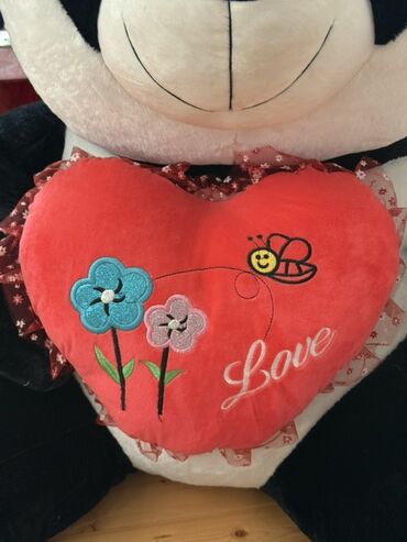 - Qucağında çıxarıla bilən qırmızı ürək yastığı var; üzərində “Love” yazısı, arı və iki çiçək naxışı, kənarında qırmızı-bəyaz bəzək lentləri