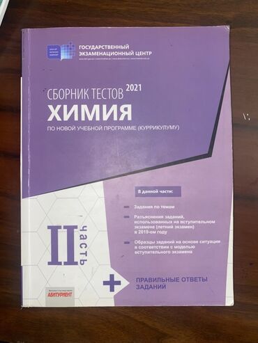 3) “Сборник тестов 2021. Химия. По новой учебной программе (куррикулуму). II часть” – mövzular üzrə testlər, 2019-cu ilin yay qəbul imtahanlarında istifadə olunmuş tapşırıqların izahları, qəbul modelinə uyğun situativ nümunələr və düzgün cavablar