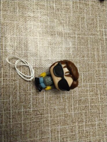- Daxil olan oyuncaq: kiçik vinil fiqur asqısı. Fiqur gün eynəkli, qəhvəyi saçlı personaj üslubunda, mavi şalvar, boz üst geyim və sarı əlcəklərlə. Asma ipi var – açarlıq, çanta bəzəyi və ya kolleksiya üçün uyğundur.