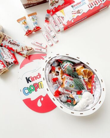 - İçlik: müxtəlif Kinder şirniyyatları və şokoladları. Şəkillərdə Kinder Bueno (klassik və 2-li baton), Kinder Chocolate batonları, Kinder Surprise yumurtaları, Kinder Schoko-Bons, Kinder Mini Barlar, həmçinin Ferrero Rocher konfetləri görünür.