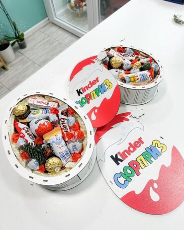- Dəyirmi, yumurta formalı bərk karton qutu, üstü “Kinder Сюрприз” loqosu ilə.