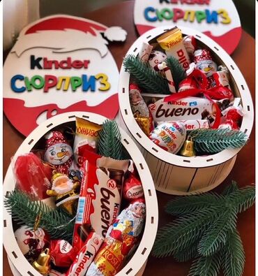- Bayram ab-havası üçün qutuların içi dekorativ ladin budaqları, qırmızı lentlər, mərmər kağız və tematik fiqurçiklər (məsələn, qış/Yeni il oyuncaqları) ilə bəzədilib.