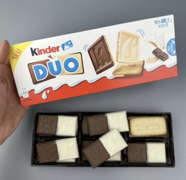- Kinder Duo – südlü və tünd şokoladlı kvadratlar, kremsi içlik və peçenye bazası ilə; 12 ədədlik qablaşdırma.