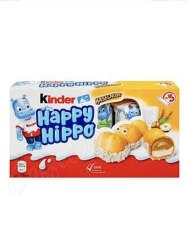 - Kinder Happy Hippo – kremsi süd və fındıq kremi ilə doldurulmuş xırtıldayan vafli fiqurlar.