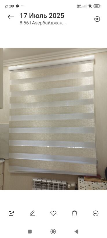 - Zebra tip jalüz pərdə. İkiqat zolaqlı parça, gündüz/gecə işıq tənzimləməsi, üst kasetli rulon mexanizmi, zəncirli idarəetmə. İşıq keçirmə səviyyəsini mərhələli tənzimləmək imkanı, mətbəx və ya qonaq otağı üçün neytral açıq bej rəng.