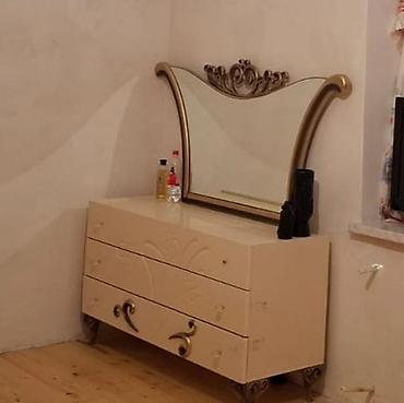 - Komod və güzgü: 3 çekmecəli, krem rəngli parlaq səth. Ön paneldə relyef naxışlar, dekorativ qızılı dəstəklər və klassik formalı ayaqlar. Üst hissədə iri güzgü – yuxarı hissəsində ornamentli qızılı çərçivə, yanları qövsvari formadadır.