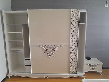 - Kupe tipli şkaf: sürüşkən qapılar, parlaq krem rəng və romb naxışlı dekor. Daxili komplektasiya – çoxsaylı rəflər, asılqan bölməsi, iki çekmece və şalvar asacağı.