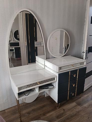 - Tuzluq/komod və makiyaj masası: iki güzgü (oval və dairəvi), üst səthlər geniş, çekmecələr və açıq bölmələr; qara-ağ rəng kombinasiyası, qızılı ayaqlar və tutacaqlar.
