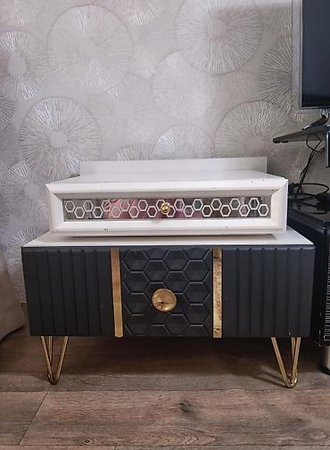 - İki ədəd tumba: bir çekmecəli üst modul və aşağıda qapalı bölmə; relyefli ön panel, qızılı xəttlər və konusvari metal ayaqlar.