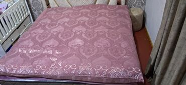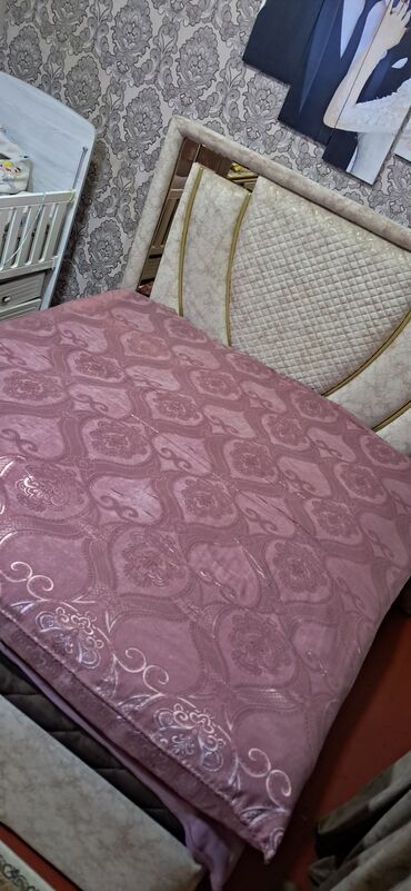 İkiterrəfli yorğan – tünd çəhrayı/ərguvan rəngdə - Material: bir üzü parlaq atlas, digər üzü mat parça (yumşaq toxumalı). - Dizayn: ortada böyük ürək, ətrafında dekorativ qarmaqarışıq tikiş naxışl...