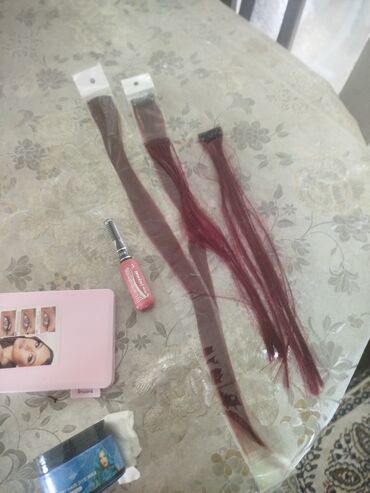 - Bordo/Qırmızı tonlarda saç tutamları – müxtəlif en və uzunluqda klipsli/şerit əsaslı 3 ədəd əlavə saç parçası (ucları uzun, nazik tekstura).