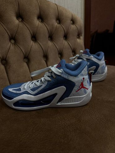 - Rəng palitrası: tünd və açıq mavi tonları, ağ detallar; daban və yan hissələrdə qırmızı “Jumpman” loqosu, dil hissəsində “JT” yazısı.