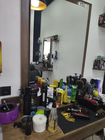 - Müasir bərbər kreslosu və geniş güzgülü iş yeri