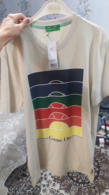 - Bej (qırıq ağ) United Colors of Benetton T‑şört: çoxrəngli tennis/top meydançası motivli böyük print, aşağıda “Game On” yazısı. Yaşıl cizgili iç yaxa detalları.