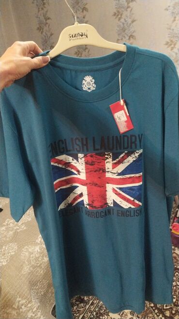 - Mavi‑yaşıl English Laundry T‑şört: önündə Union Jack bayrağı temalı böyük print və “ENGLISH LAUNDRY” yazısı. Rahat, düz kəsim.