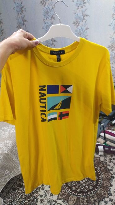 - Sarı Nautica T‑şört: ön paneldə dəniz siqnal bayraqları və yelkən qrafikası, “NAUTICA” vertikal yazı. Yumşaq trikotaj, dairəvi yaxa.
