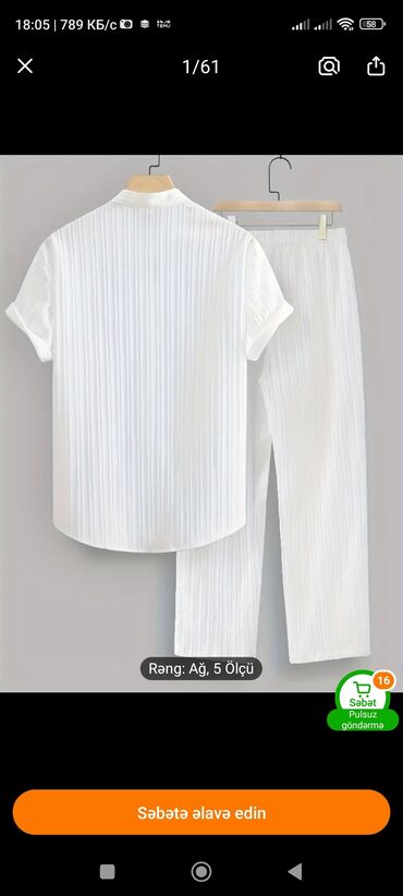Ağ rəngdə, büzməli parçadan hazırlanmış kişi köynək və şalvar dəsti. Köynək qısaqollu, düyməli bağlanma və dik yaxalıdır. Şalvar uzun, sərbəst kəsimli və bağcıqlı belə malikdir. Rahat və gündəlik istifadə üçün uyğun olan bu dəst müxtəlif bədən ölçülərinə uyğun olaraq 5 fərqli ölçüdə təqdim olunur. Pulsuz çatdırılma imkanı ilə.