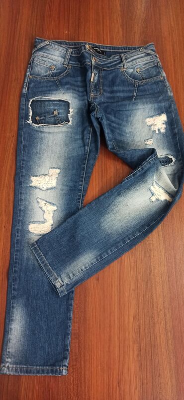 - Dizayn: ön və arxa hissədə ripped/dağınıq kəsik detalları, sol budda böyük kəsik üzərində daxili cib görünüşü