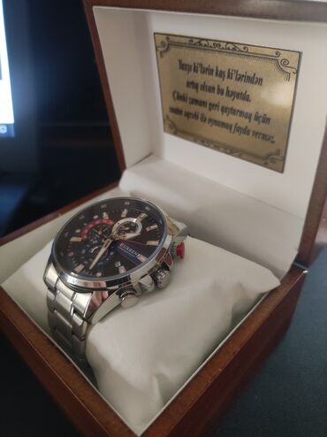- Korpus: Parlaq metal (gümüş rəng), sağ tərəfdə xronoqraf düymələri və qırmızı start düyməsi