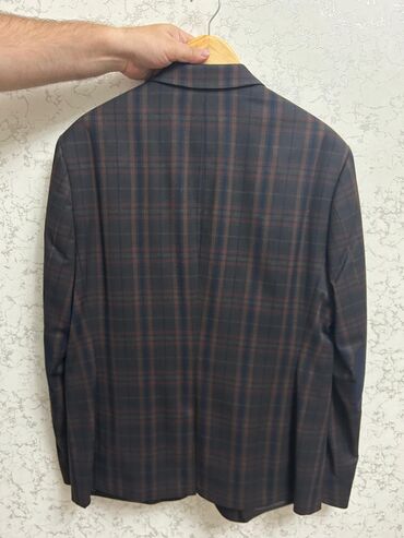 Kişi kostyum gödəkçəsi (şəkildəki). - Rəng: boz/boz-mavi ton - Model: klassik, iki düyməli, ingilis yaxası (notch lapel) - Ölçü: 48 (şəkildə qeyd olunub) - Ciblər: 2 ədəd yan flepli cib, 1 ə...