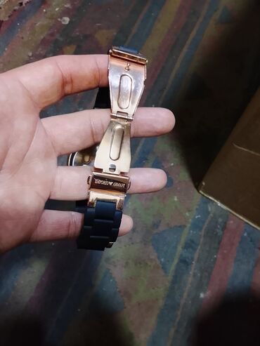 - Qara silikon/kauçuk kəmər, qatlanan (butterfly) qapanma; qapaqda Emporio Armani loqosu