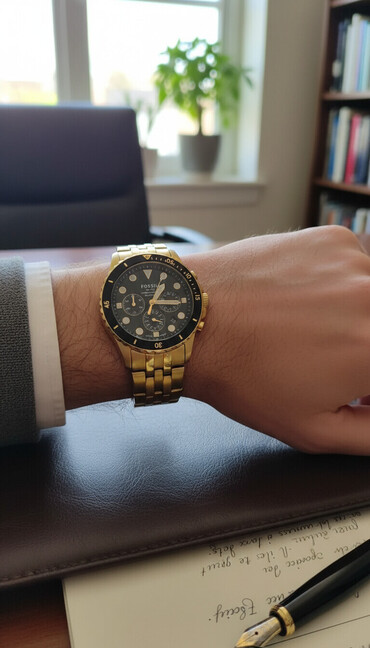 - Korpus və qolbaq: qızılı rəngli metal (paslanmayan polad görünüşlü), klassik halqa-bağlayıcı bracelet