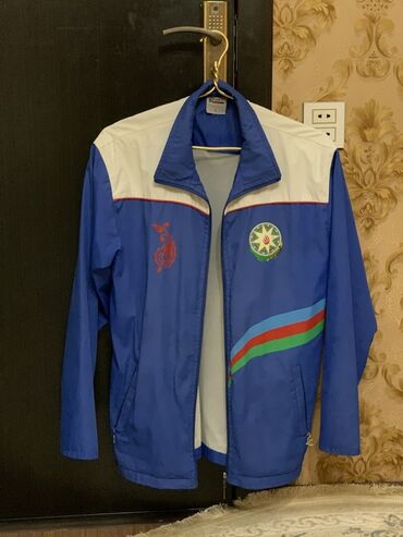 Azerbaijan komanda stilində idman gödəkcəsi - Rənglər: ağ gövdə, kobalt-mavi qol və çiyin hissələri, qırmızı nazik xətt detalları - Ön hissə: tam uzunluqlu fermuar, yüksək yaxalıq; sol döşdə milli...