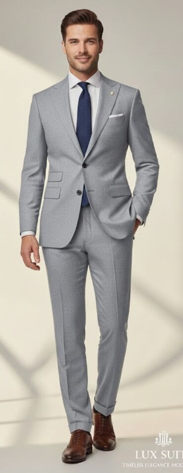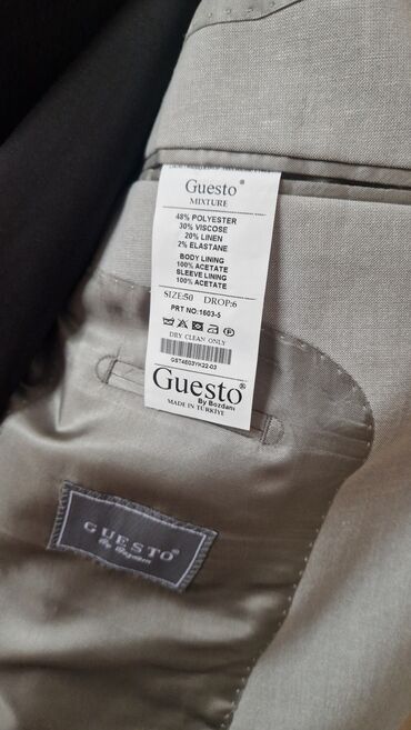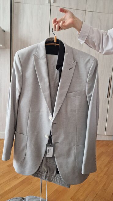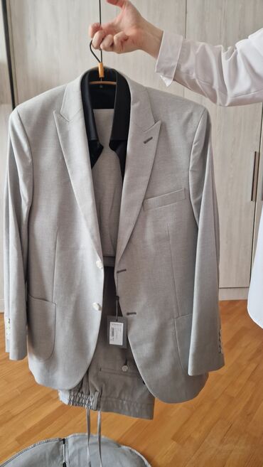 Geyim sifarişlə yeni alınıb gətirilib və sadəcə 44-0 ölçüsü uyğun gəlmədiyindən satılır. İki parçalı kişi kostyumu – qrafit boz rəngdə - Üst: ikicərgəli düymələmə, geniş haşiyəli (peak lapel) yaxa,...
