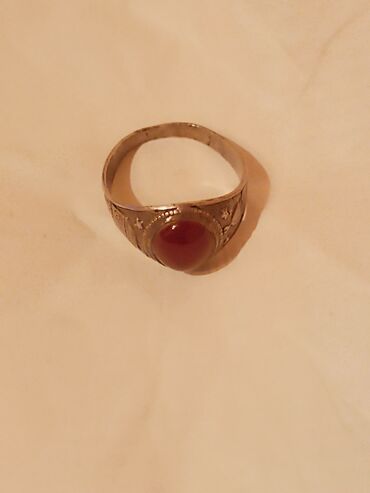 Kişi üzüyü – klassik model - Material: gümüş rəngli metal korpus - Daş: oval, qabarıq kaboşon kəsimli, tünd qırmızı (yəqin ki, aget/karneol tipli dekorativ daş) - Dizayn: bənddə və başlıqda relyef ...Giriş•Qeydiyyat
