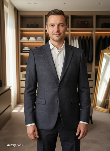 - Rəng: tünd boz, incə xətli (micro-check/çizgili) naxış