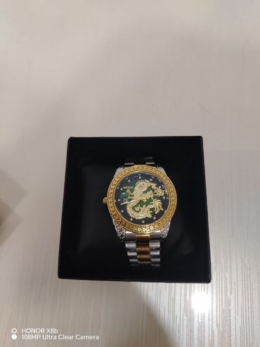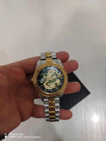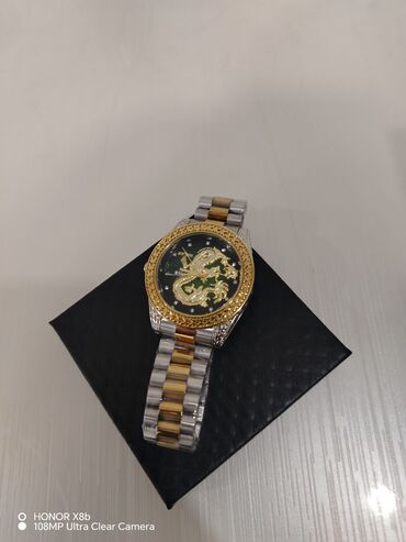 - Qara siferblatın üzərində detallı qızılı “əjdaha” motivi və indekslər.