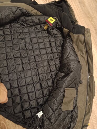 Qutuda ikinci fotoda göstərilən mavi gödəkçə yalnız vitrin nümunəsidir; satılan məhsul CAT brendli zeytun-yaşıl modeldir.
