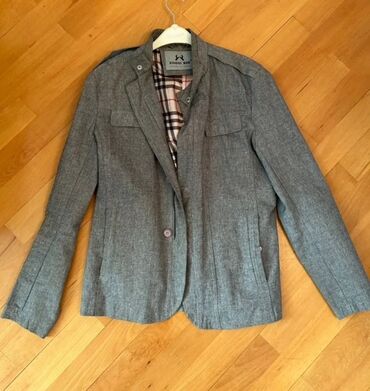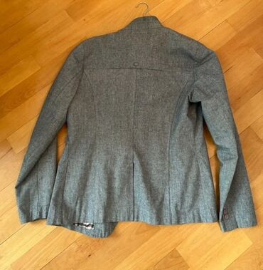 Kişi kostyum gödəkçəsi (şəkildəki). - Rəng: boz/boz-mavi ton - Model: klassik, iki düyməli, ingilis yaxası (notch lapel) - Ölçü: 48 (şəkildə qeyd olunub) - Ciblər: 2 ədəd yan flepli cib, 1 ə...