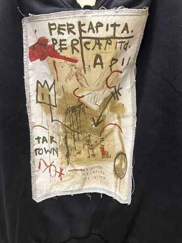 - Arxa hissə: iri ölçülü parça-패치 üzərində Basquiat üslubunda “PER CAPITA” və digər yazılarla rəsm kompozisiyası; xam kənarlı tikiş detalı