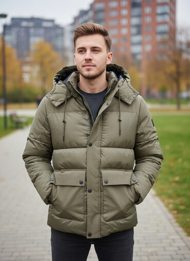 Qışlıq kişilər üçün kapüşonlu şişmə gödəkçə