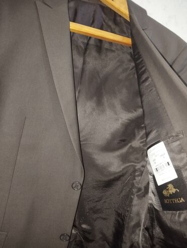 Kişi kostyumu – iki parçalı - Rəng: tünd boz, incə xətli (micro-check/çizgili) naxış - Model: 2 düyməli klassik pencək, dar krujevalı (notch) yaxa - Pencəkdə: sinə cibinin üstü (bilet cibi görünüş...