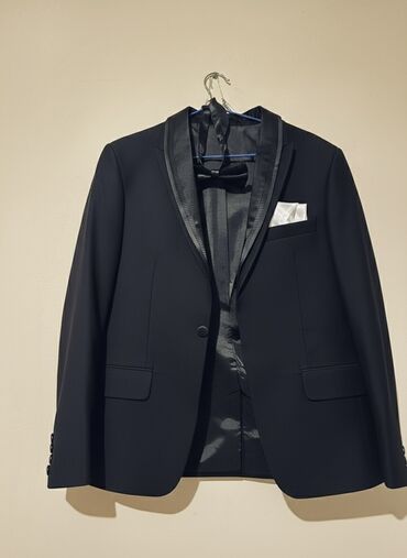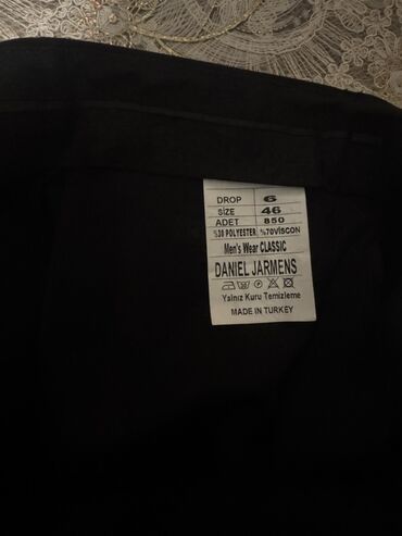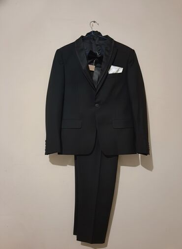 Kişi kostyumu – iki parçalı - Rəng: tünd boz, incə xətli (micro-check/çizgili) naxış - Model: 2 düyməli klassik pencək, dar krujevalı (notch) yaxa - Pencəkdə: sinə cibinin üstü (bilet cibi görünüş...