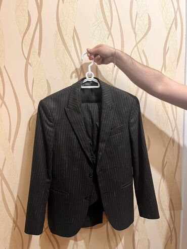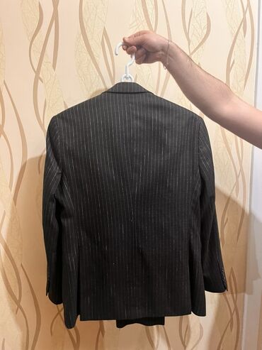 Kişi kostyum dəsti – tünd boz (qara tonlarda) incə ağ zolaqlı klassik model.