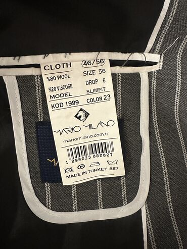 Kişi kostyumu - 1 dəfə geyilib, cibləri sökülməyib Material : 60% yun, 20% viskoz, 20% polister Ölçü 44 - 182