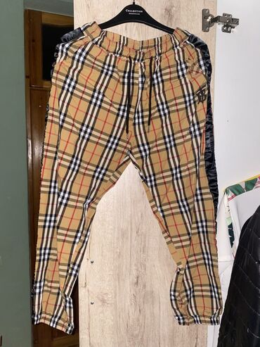 - Şalvar: bej fon üzərində qara-ağ-qırmızı klassik Burberry xətli naxış. Elastik bel və iplə büzmə, daralan bala hissə. Ön hissədə “TB” monoqramı.
