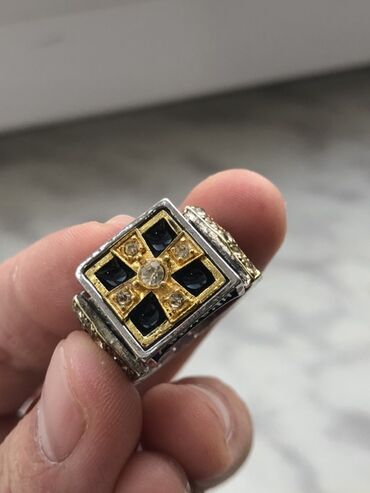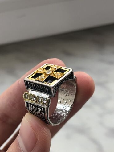 İki ədəd kişi üzüyü dəsti. - Üzük 1: Boz/antique tonda massiv kişi üzüyü. Ön hissədə dairəvi medalion formasında relyef naxışlı fon və kəsişən iki xəncər simvolu. Kənarları zəncirvari ornamentlə, ...