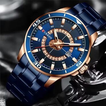CURREN kişi qol saatı – idman və klassikanın birləşməsi. Xüsusiyyətlər: - Korpus: mavi tonlu paslanmayan polad, qızılı detal vurğuları - Kəmər: metal/çelik möhkəm qolbaq, mavi rəng - Göstəricilər:...
