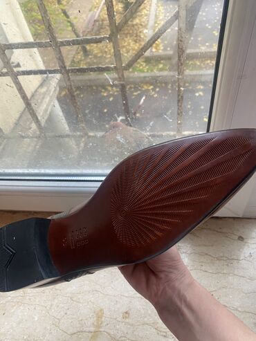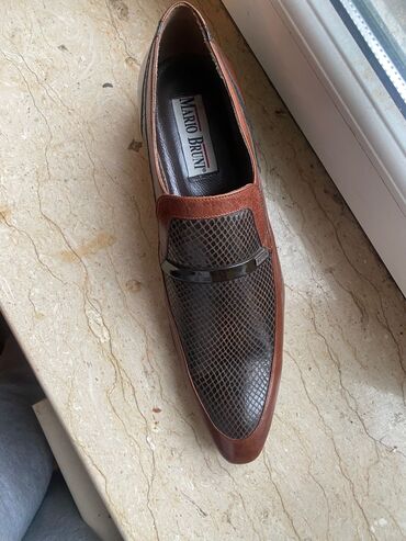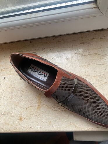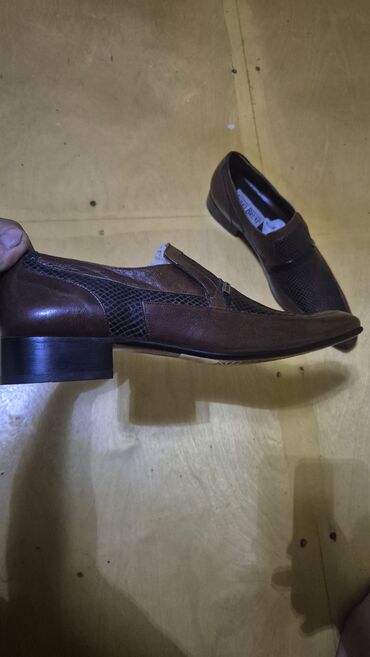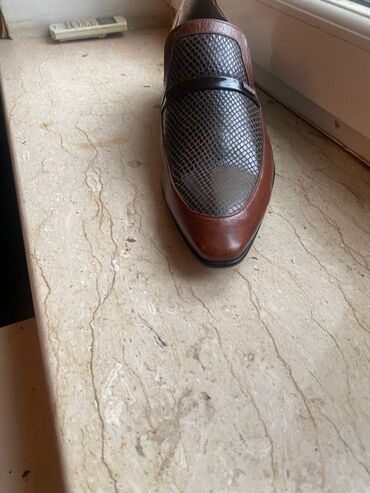 - Dizayn: uzun, sivri burun; üst hissədə tünd naxışlı (pulcuq teksturalı) dəri panellər və dekorativ tünd kəmər detallı klassik loafer kəsimi