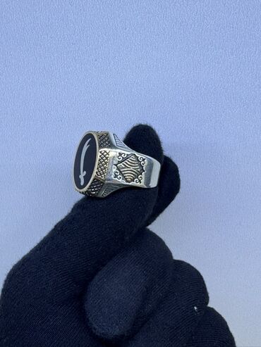 Kişi üzüyü – klassik şərq üslubunda - Metal: gümüş tonlarında ərintidən hazırlanmış korpus - Daş: üzün mərkəzində iri, çoxüzlü qara daş (fasetli parıltı verir) - Dizayn: baş hissə ətrafında muncuq...