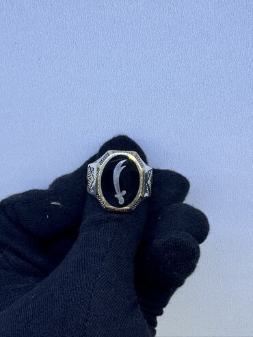 Kişi üzüyü – klassik orient motivli - Material: gümüş tonlu korpus, üst hissədə qızılı rəngli haşiyə - Daş: oval formalı qara daş (kaboşon kəsim), yüksək montaj - Dizayn: gövdə boyunca yunan açarı...Giriş•Qeydiyyat