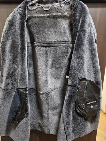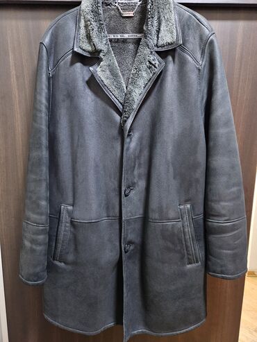 Kişi üçün dərili kürk palto - Material: üst hissə təbii dəri, içlik qalın xəz (qəhvəyi rəngdə), yumşaq və isti. - Rəng: qara (dəri), içi qəhvəyi. - Dizayn: düz kəsim, geniş xəzli yaxa, ön hissə dü...