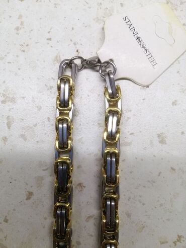 - Zəncir: İri həlqəli, iki rəngli dizayn (qızılı və polad tonlarının kombinasiyası). Hər həlqə segmentli quruluşa malikdir, səthləri parlaq cilalanıb.