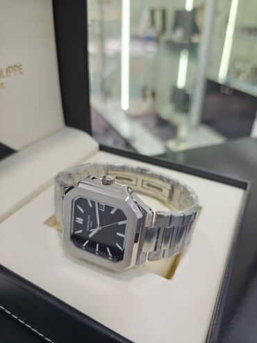 Patek Philippe kişi qol saatı – paslanmayan poladdan korpus və brelok, səkkizguşəli (yastı) bezel dizaynı. Qara rəngli, üfüqi naxışlı siferblat; ağ indekslər və oxvari əllər, saniyə əli mərkəzdə. Saat 3 mövqeyində tarix pəncərəsi. Mineral/Safir tipli ön şüşə görünüşlü, arxa qapaq isə şəffaf mexanizmi nümayiş etdirən vintli örtükdür.